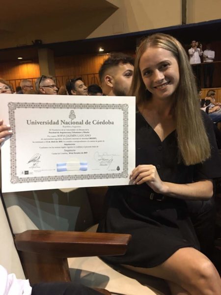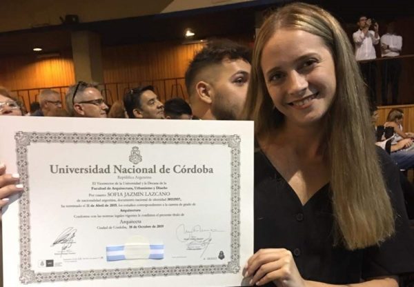 Sofía, se recibió el pasado 11 de abril tras cursar sus estudios en la Facultad de Arquitectura, Urbanismo y Diseño de la Universidad Nacional de Córdoba y recibió su título el día jueves 5 de diciembre pasado.