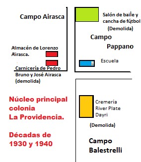 Aquí en nuestra zona fueron muy conocidos los emprendimientos de Colonia La Providencia y Colonia Santa Ana. Según recuerdan los pobladores, -entre ellos el Sr. Abel Pappano- la cremería de La Providencia se fundó en 1930 en el campo de la Familia Balestrelli, este fue el puntapié de esta pequeña población. En el año 1934 se abre una carnicería cuyos dueños eran Pedro Bruno y José Airasca, posteriormente se funda el primer almacén de ramos generales, el mismo pertenece a Lorenzo Airasca. Para completar el núcleo urbano se funda la escuela primaria en el campo de la familia Pappano y se levanta un salón de baile en el mismo campo.