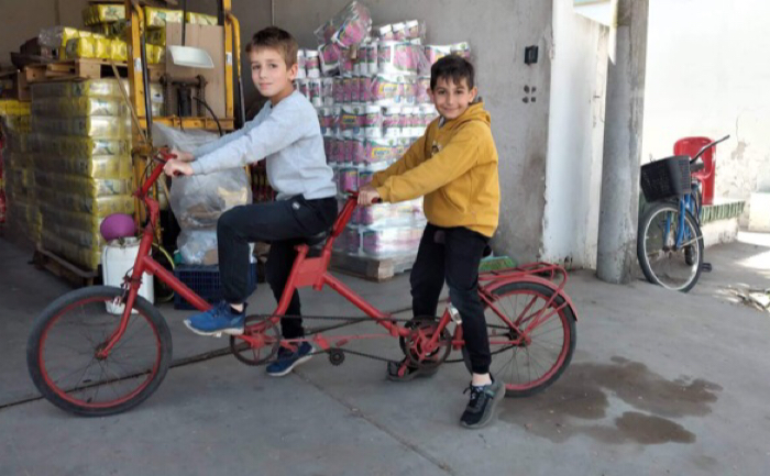 Hoy se los vio felices a bordo de la bicicleta que hizo el abuelo Edgardo.