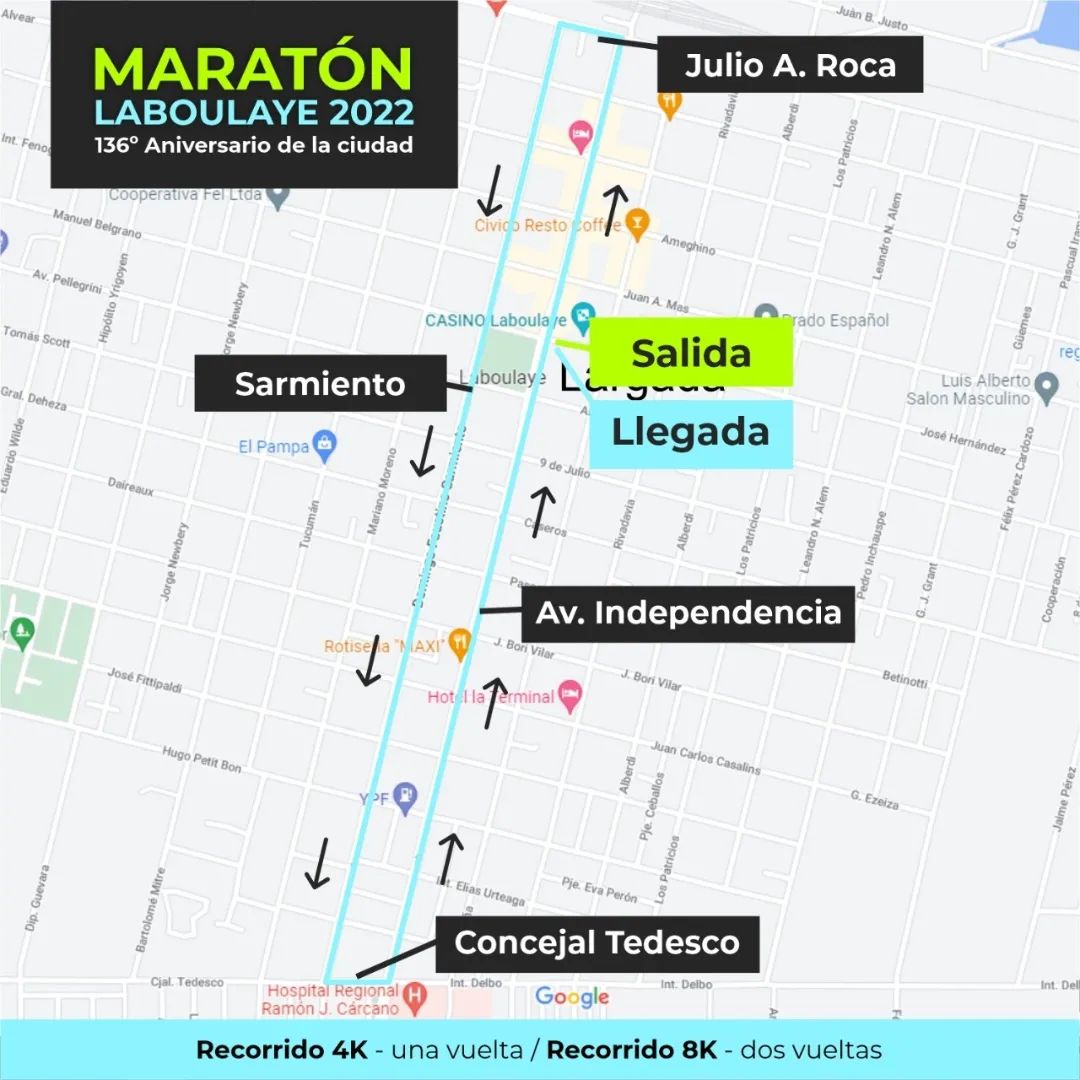 Los corredores deberán iniciar su periplo en Plaza General Paz hacia el norte por calle Independencia, llegando y doblando hacia el Oeste en calle Roca, retomando por calle Sarmiento en sentido Sur, llegando hasta calle Consejal Tedesco para virar por la misma en sentido este y culminando la maratón por calle Independencia hasta llegar a la Palaza principal. Quienes realicen la maratón de 4 kilómetros solo darán una vuelta, mientras quienes se inscriban para la maratón de 8 kilómetros deberán realizar dos veces el mismo recorrido.