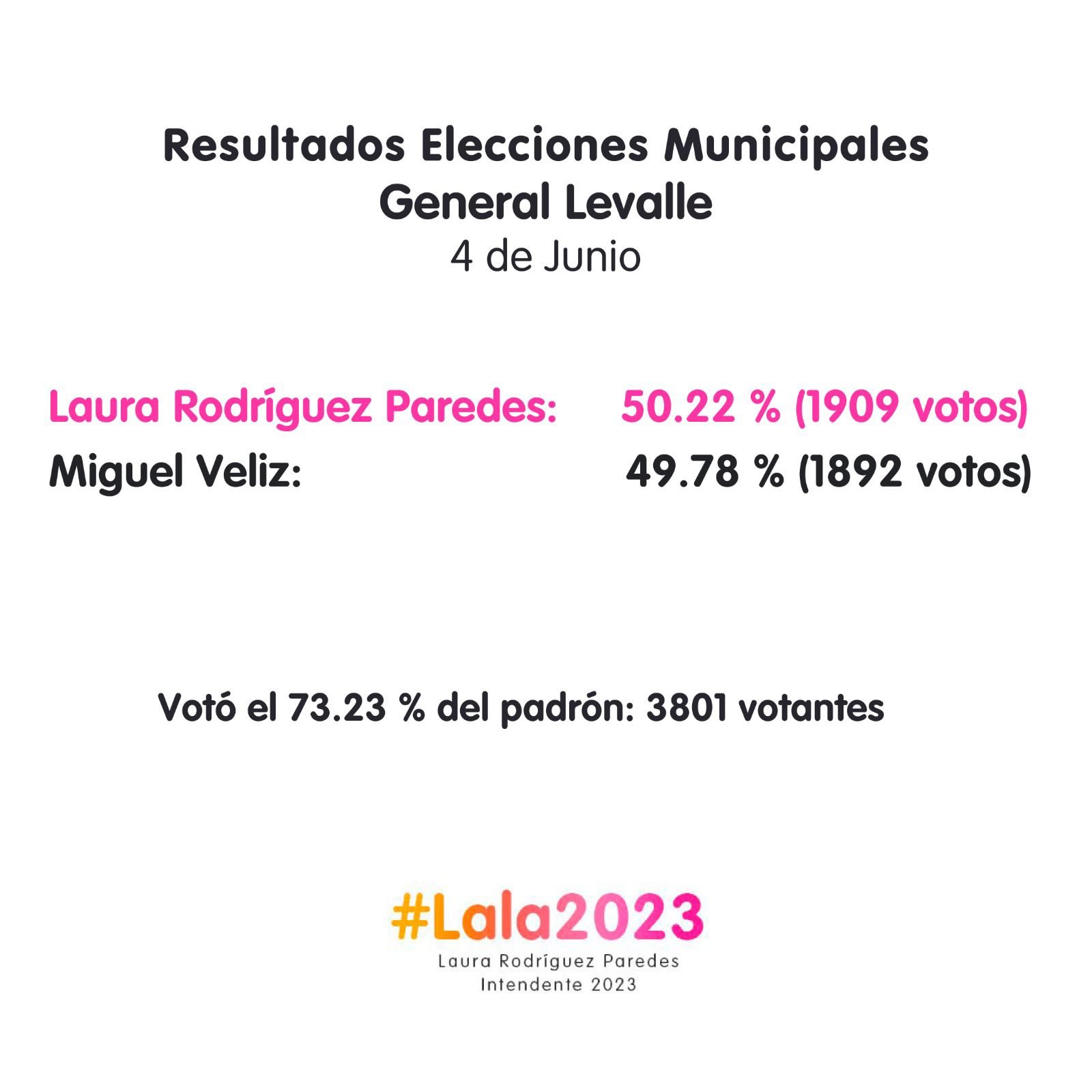 La candidata a intendente municipal de General Levalle de Juntos por el Cambio, Laura Rodríguez Paredes, resultó electa para ese cargo esta tarde luego de una muy reñida votación en dicha localidad del Departamento Presidente Roque Sáenz Peña.
