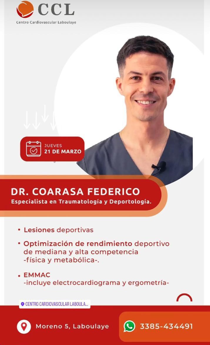 El Centro Cardiovascular Laboulaye anuncia la vuelta del Dr. Federico Coarasa el próximo jueves 21 de marzo.
