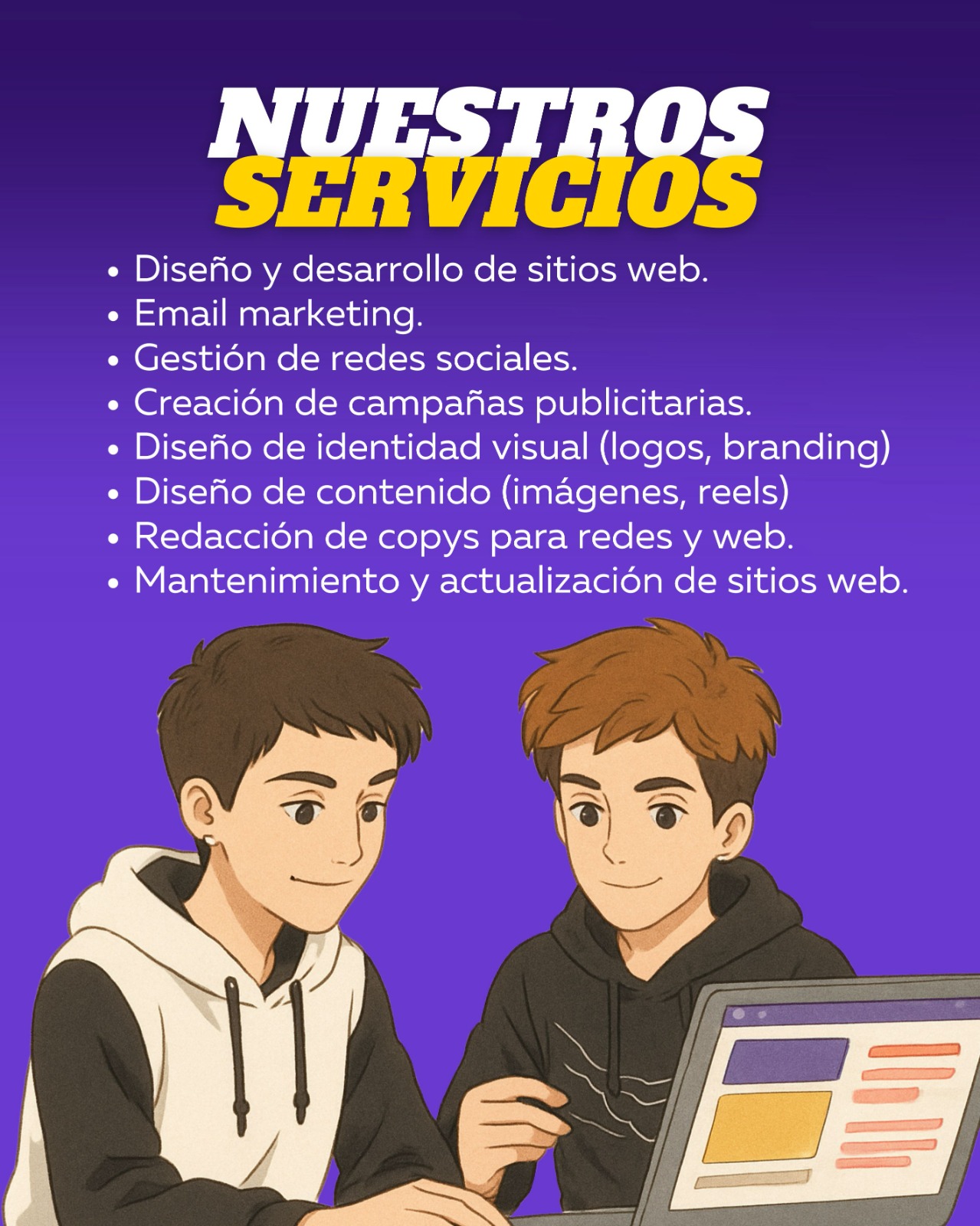 - Diseño y Desarrollo Web: sitios web responsive, tiendas online y landing pages.