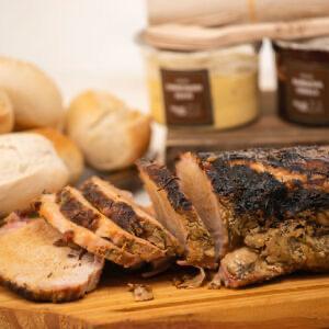 compost de carré de cerdo con salsas varias, panes, empanadas y las