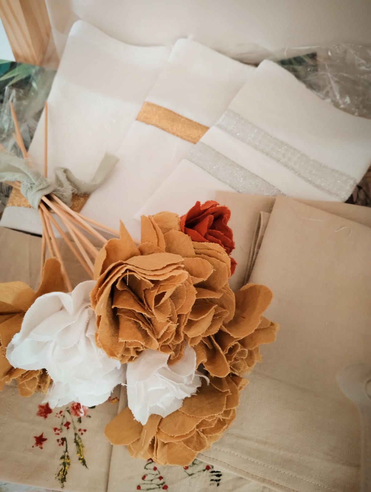 manteles confeccionados artesanalmente en tusor, lienzo y gasa, con diseños suaves y elegantes que realzan cualquier mesa. También ofrecen
