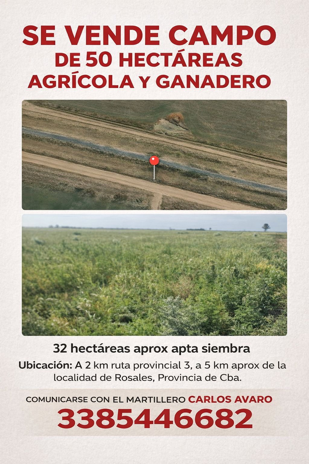 Entre las propuestas de venta, se destaca un campo agrícola-ganadero de 50 hectáreas, de las cuales 32 hectáreas aproximadamente son aptas para siembra. El inmueble se encuentra ubicado a 2 km de la Ruta Provincial N° 3 y a 5 km de la localidad de Rosales, en la provincia de Córdoba.