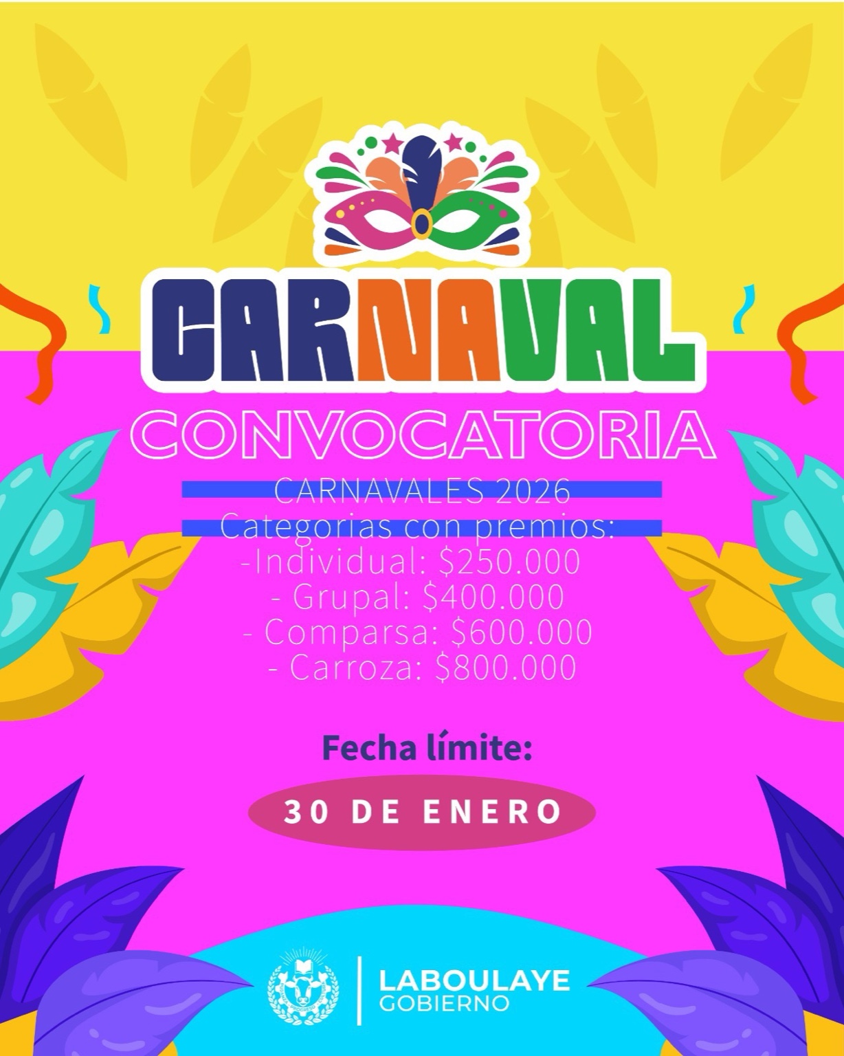 El Gobierno de Laboulaye anunció oficialmente días atrás la apertura de la convocatoria para participar de los Carnavales 2026, una de las celebraciones más tradicionales y convocantes de la ciudad que regresa este año.