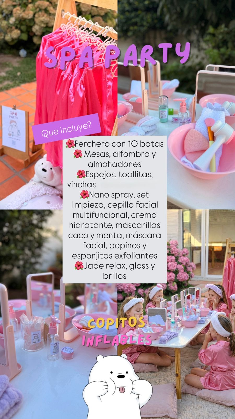 Spa Party, una experiencia pensada para los más pequeños que incluye perchero con 10 batas, mesas, alfombra, almohadones, espejos, toallitas y vinchas. Además, se suman elementos como nano spray, set de limpieza, cepillo facial multifuncional, crema hidratante, mascarillas de cacao y menta, máscara facial, pepinos, esponjitas exfoliantes, jade relax, gloss y brillos, creando un espacio de