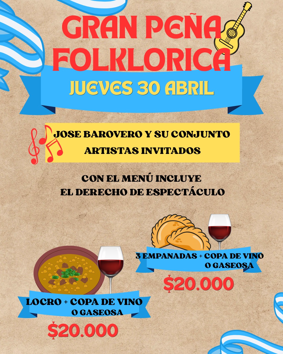 La propuesta incluye una experiencia gastronómica completa, ya que el menú incorpora el derecho de espectáculo. Los asistentes podrán optar entre 3 empanadas con copa de vino o gaseosa, o bien locro con copa de vino o gaseosa, ambos con un valor de $20.000.